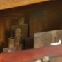 Der untere Uhrenkasten mit den Gewichten. Das Steinerne wiegt stolze 10 kg. -