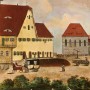 Die älteste bekannt Ansicht des Gasthofe vom 12. Januar 1872, als Rückwand der Flötenuhr im Magaretenzimmer -