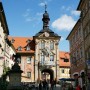 Das Wahrzeichen der Stadt, das alte Rathaus auf einer Brücke mitten in der Regnitz, heute ein Museum und Touristinformation -