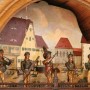 Fünf holzgeschnitzte Musikanten bewegen sich während des Spiels, sie setzen zu Beginn ihre Instrumente an und der Mittlere klatscht zum Takt die Hände. -