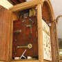 Der geöffnete obere Teil der Standuhr mit der gesamten Mechanik, dem Zimmerblatt, den 5 geschnitzten Musikern und dem Hintergrundbild. -
